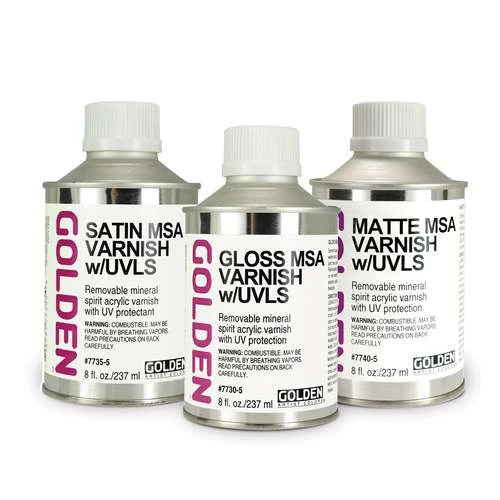 Golden MSA UVLS varnish, acrylic resin-based, and forming a thin, yet tough and waterproof protective film for artwork.