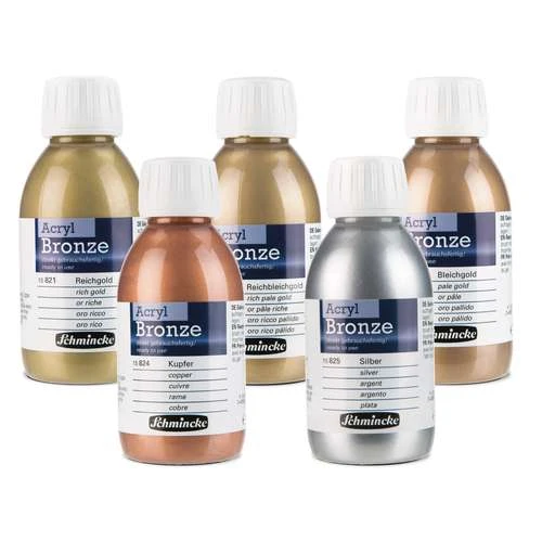 If necessary Schmincke Acrylic Bronze can be diluted with water. It dries both smearproof and waterproof. Schmincke Acrylic Bronze is available in 150ml jars.
