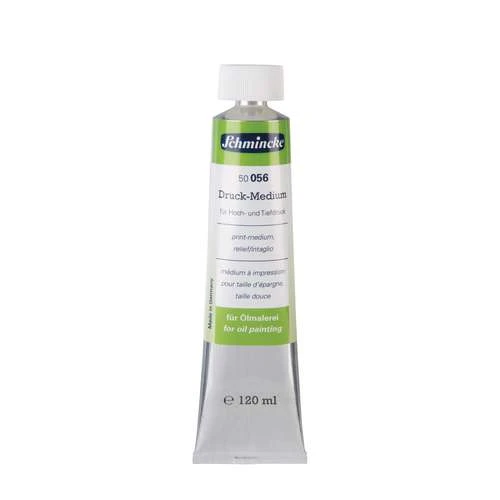 Schmincke Printing Medium contains stand oil. After use, printing blocks and working materials can be cleaned with all cleaning agents suitable for oil painting. This Schmincke Printing Medium is available in 120ml tubes in transparent or black, for light and dark colours.