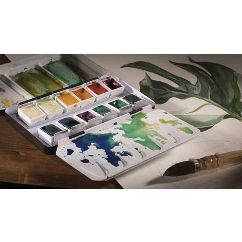 The metal watercolour box is presented in a beautiful cardboard case. It contains 12 pans of this popular artist’s watercolour paint by Rembrandt, plus a removable mixing palette and a high-quality red sable hair watercolour brush.