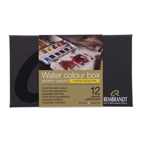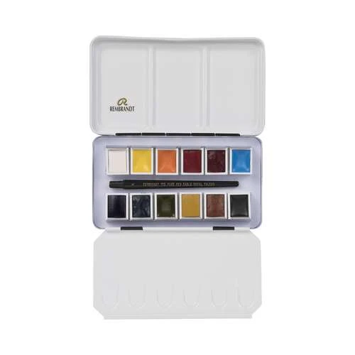 The metal watercolour box is presented in a beautiful cardboard case. It contains 12 pans of this popular artist’s watercolour paint by Rembrandt, plus a removable mixing palette and a high-quality red sable hair watercolour brush.